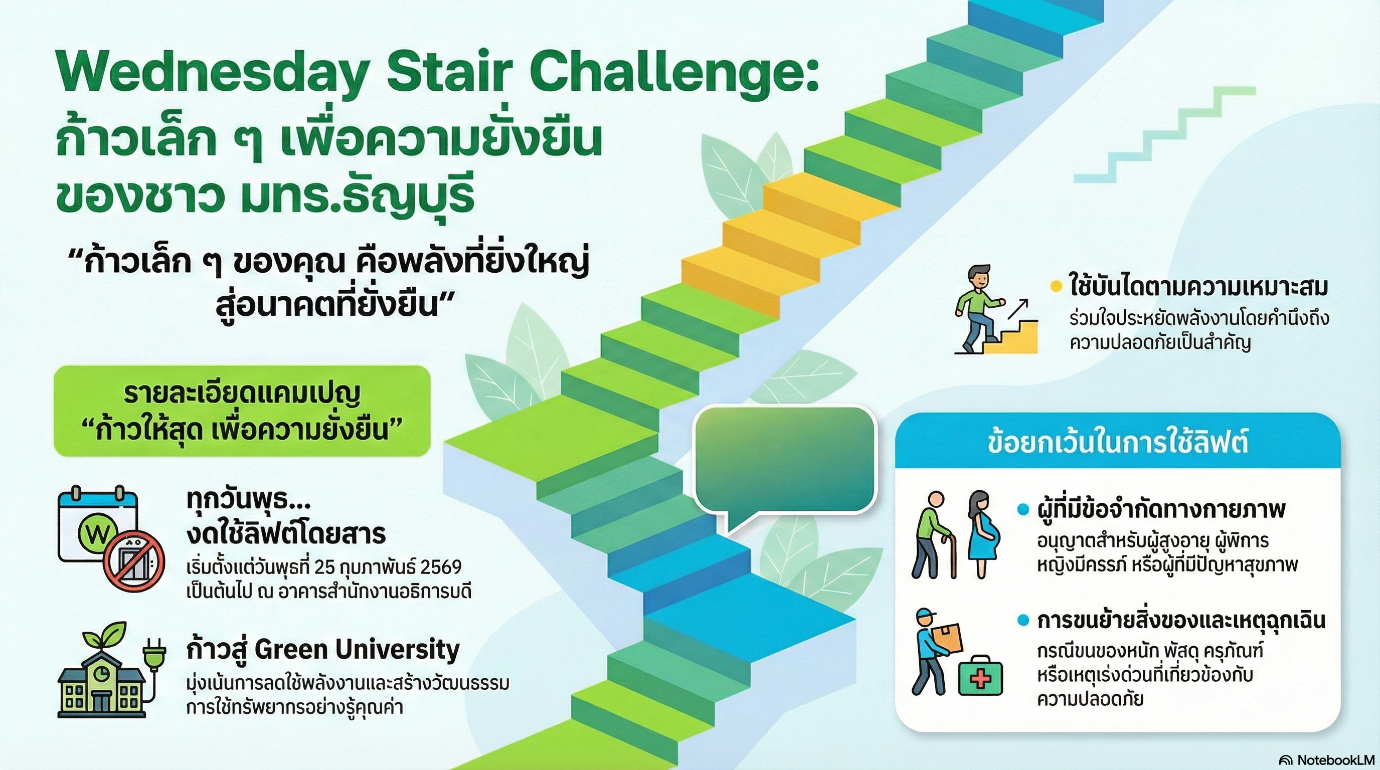 อินโฟกราฟิกที่สร้างขึ้นด้วยเทคโนโลยี AI เพื่อประชาสัมพันธ์กิจกรรม Wednesday Stair Challenge ชวนบุคลากรและนักศึกษาใช้บันได ลดการใช้พลังงาน และเสริมสุขภาพ ตามแนวทางมหาวิทยาลัยสีเขียวของ มทร.ธัญบุรี