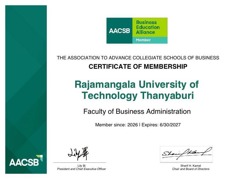คณะบริหารธุรกิจ (RTBS) มหาวิทยาลัยเทคโนโลยีราชมงคลธัญบุรี ได้รับการรับรองเข้าเป็นสมาชิก Business Education Alliance ของ AACSB