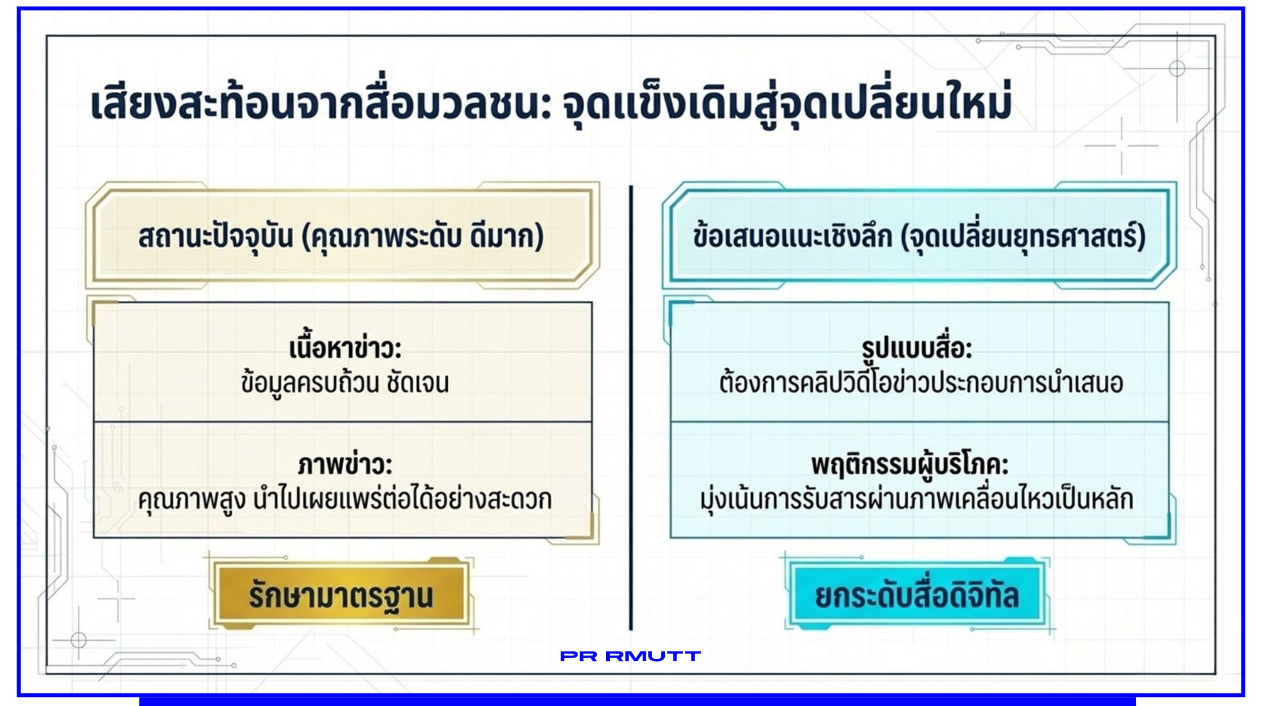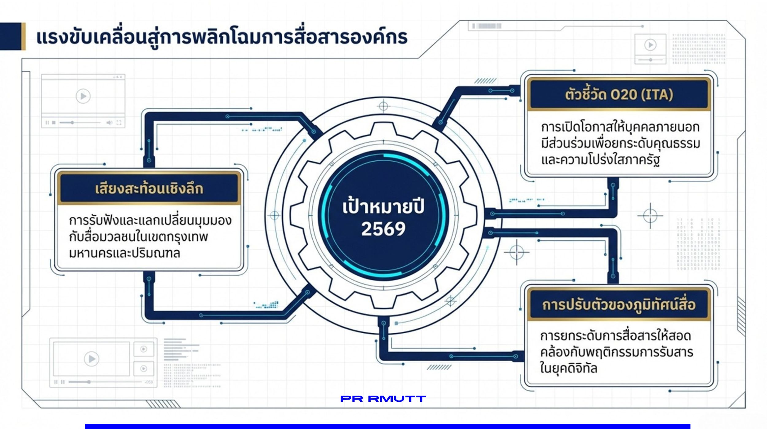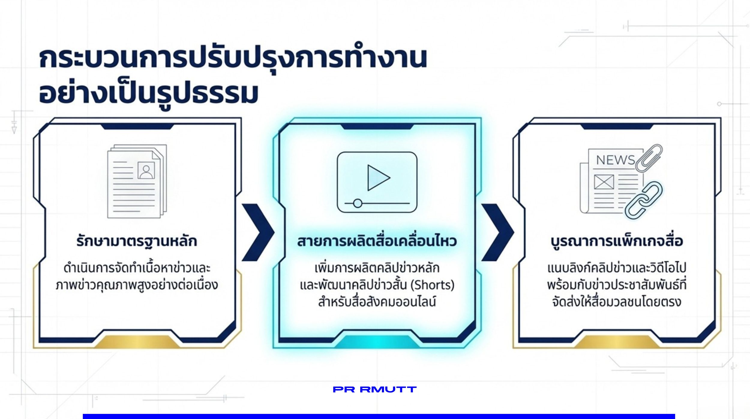 อินโฟกราฟิกแสดงกระบวนการปรับปรุงการทำงานด้านสื่อสารองค์กร ตั้งแต่การรักษามาตรฐานข่าว การพัฒนาสื่อวิดีโอและคอนเทนต์เคลื่อนไหว จนถึงการบูรณาการแพ็กเกจสื่อเพื่อสื่อสารกับสื่อมวลชนอย่างมีประสิทธิภาพ