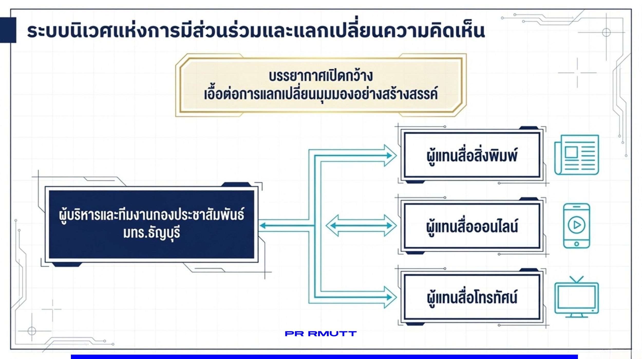 อธิการบดี มทร.ธัญบุรี ยังกล่าวเพิ่มเติมว่า การเปิดพื้นที่ให้สื่อมวลชนมีส่วนร่วมและสะท้อนความคิดเห็นโดยตรง ถือเป็นกลไกสำคัญในการยกระดับคุณภาพการสื่อสารของมหาวิทยาลัยให้ทันต่อการเปลี่ยนแปลงของภูมิทัศน์สื่อในยุคดิจิทัล อีกทั้งยังช่วยเสริมสร้างความเชื่อมั่น ความเข้าใจที่ถูกต้อง และความสัมพันธ์อันดีระหว่างมหาวิทยาลัยกับสื่อมวลชนและสาธารณชนในระยะยาว
