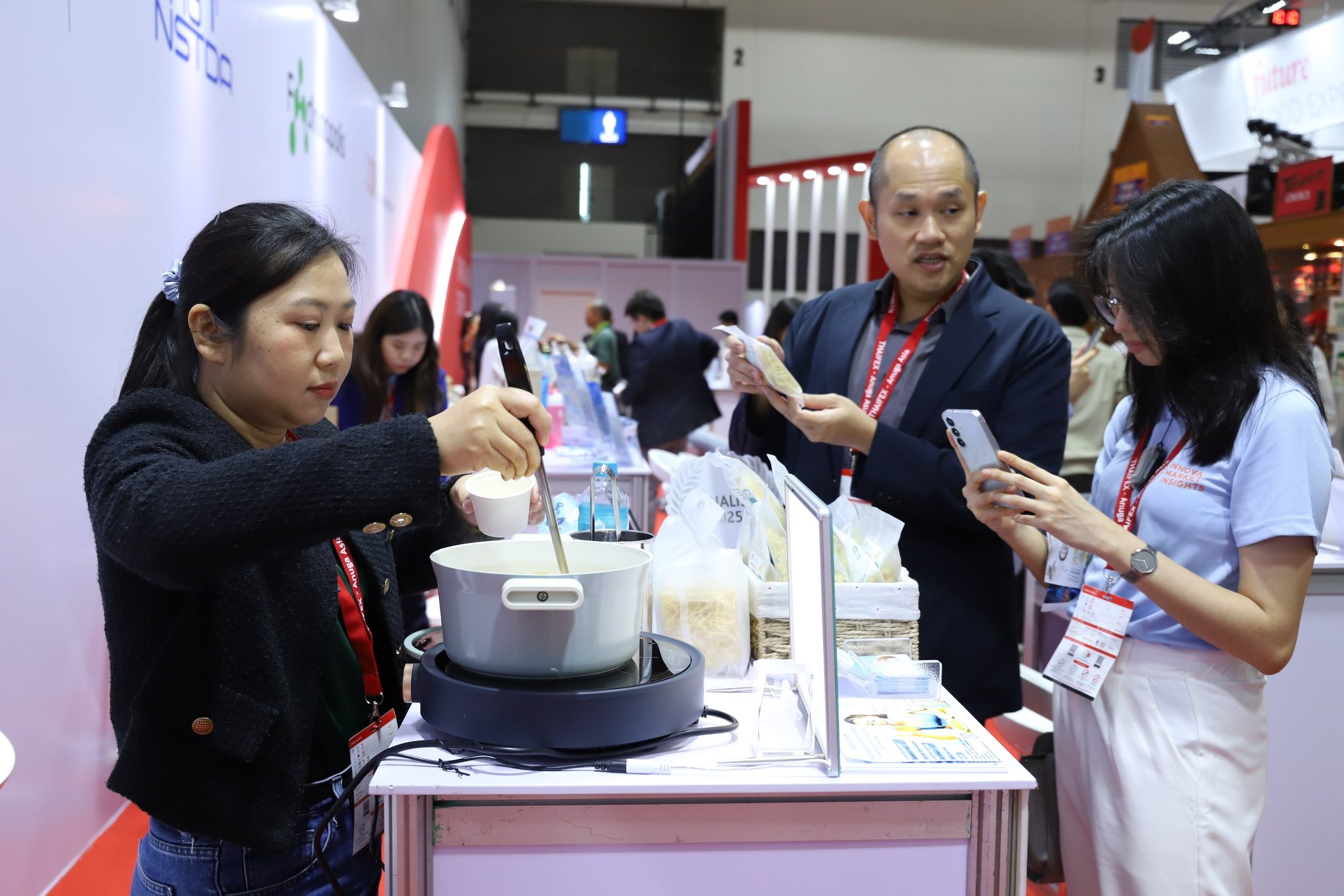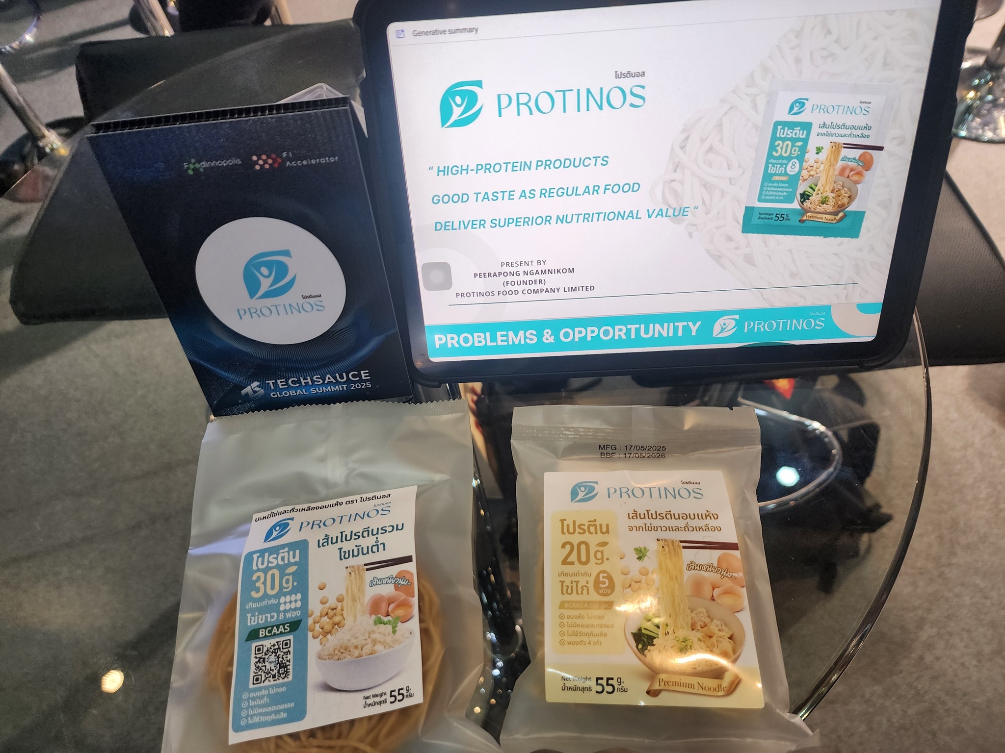 สำหรับการนำไปประกอบอาหารและเวทีนวัตกรรม เพื่อตอกย้ำว่า Food Innovation คือ เนื้อสัมผัสที่โดดเด่น Protinos Noodle ได้รับเลือกให้เข้าร่วมนำเสนอในงาน FOREFOOD COHORT #5 DEMO DAY ซึ่งเป็นส่วนหนึ่งของโปรแกรม Forefood Accelerator จัดโดย เมืองนวัตกรรมอาหาร (FoodInnopolis) สวทช. ร่วมกับ บริษัท บุญรอดบริวเวอรี่ จำกัด ในงานนี้ ทีมงานได้สร้างสรรค์เมนูพิเศษนั่นคือ ‘เส้นโปรตีน ผัดพริกแห้ง กระเทียม กุ้ง’ โดยใช้เส้นโปรตีนสูงเป็นวัตถุดิบหลัก เมนูนี้แสดงให้เห็นว่าผลิตภัณฑ์สามารถนำไปประกอบอาหารได้หลากหลาย ไม่จำกัดอยู่แค่เมนูสำหรับผู้ป่วย แต่ยังสามารถสร้างสรรค์เป็นเมนูฟิวชั่นรสเลิศที่คนทุกวัยสามารถบริโภคได้ เป็นการเปิดประสบการณ์อาหารอนาคต ที่มีโภชนาการสูงและรสชาติที่ดีไปพร้อมกัน