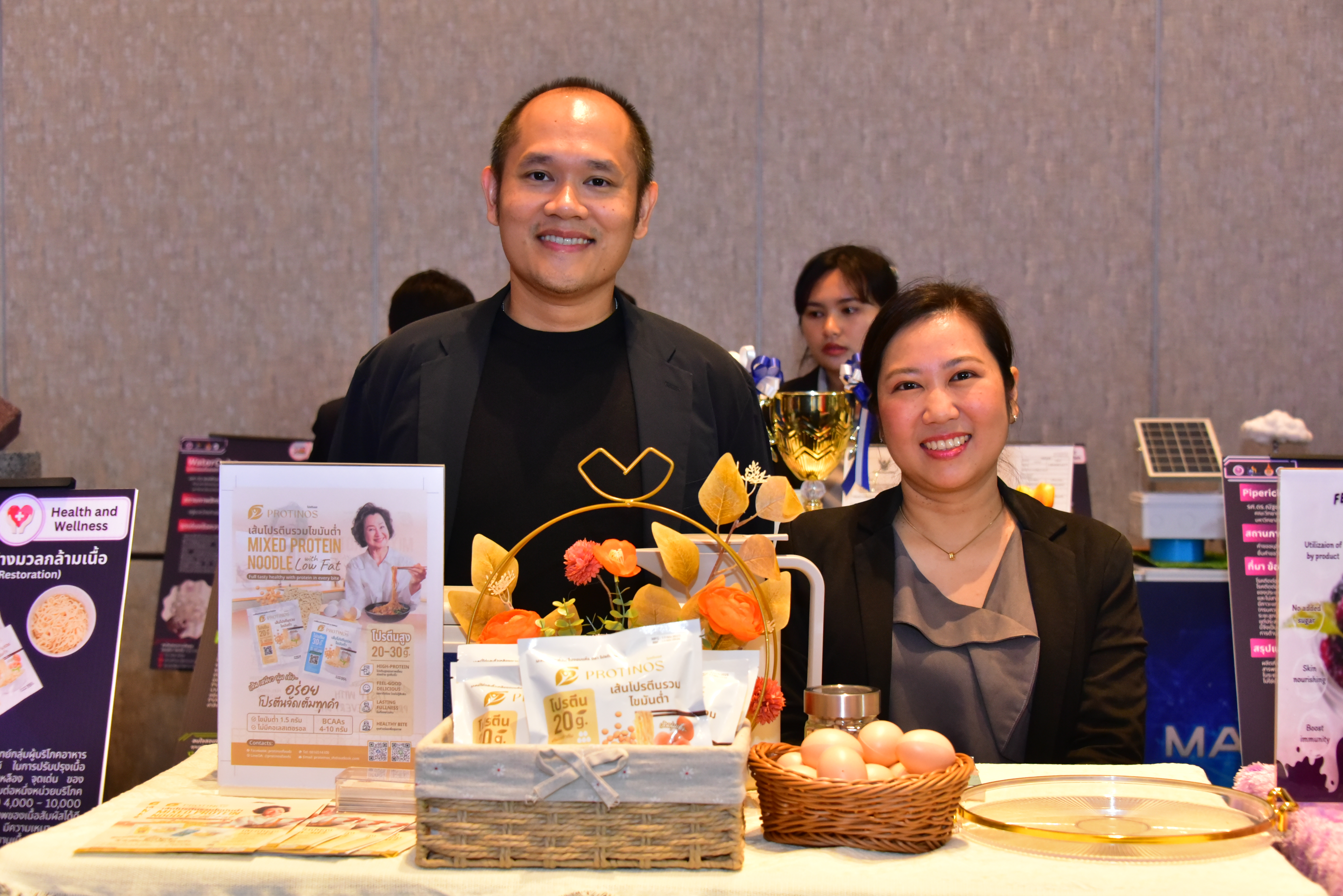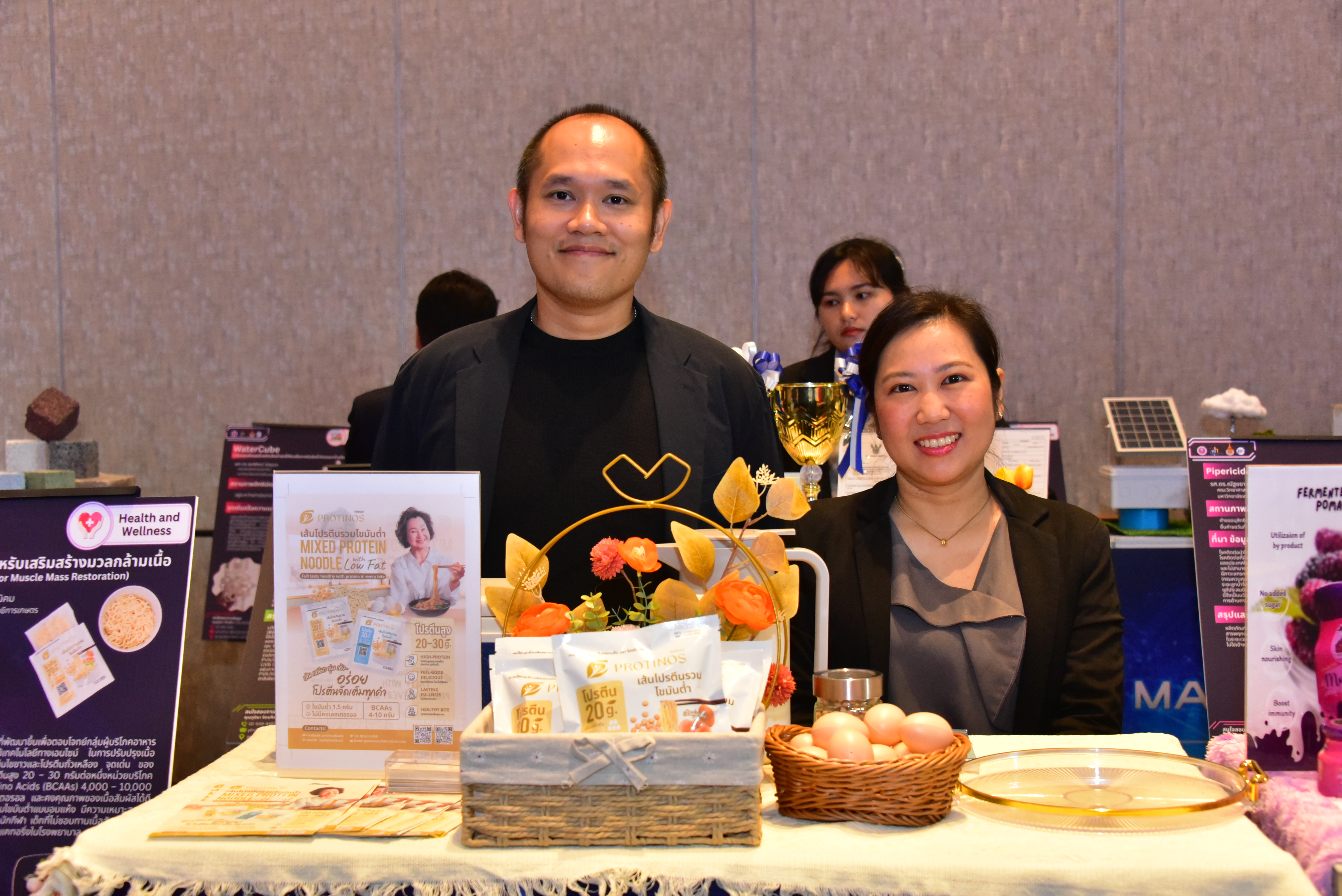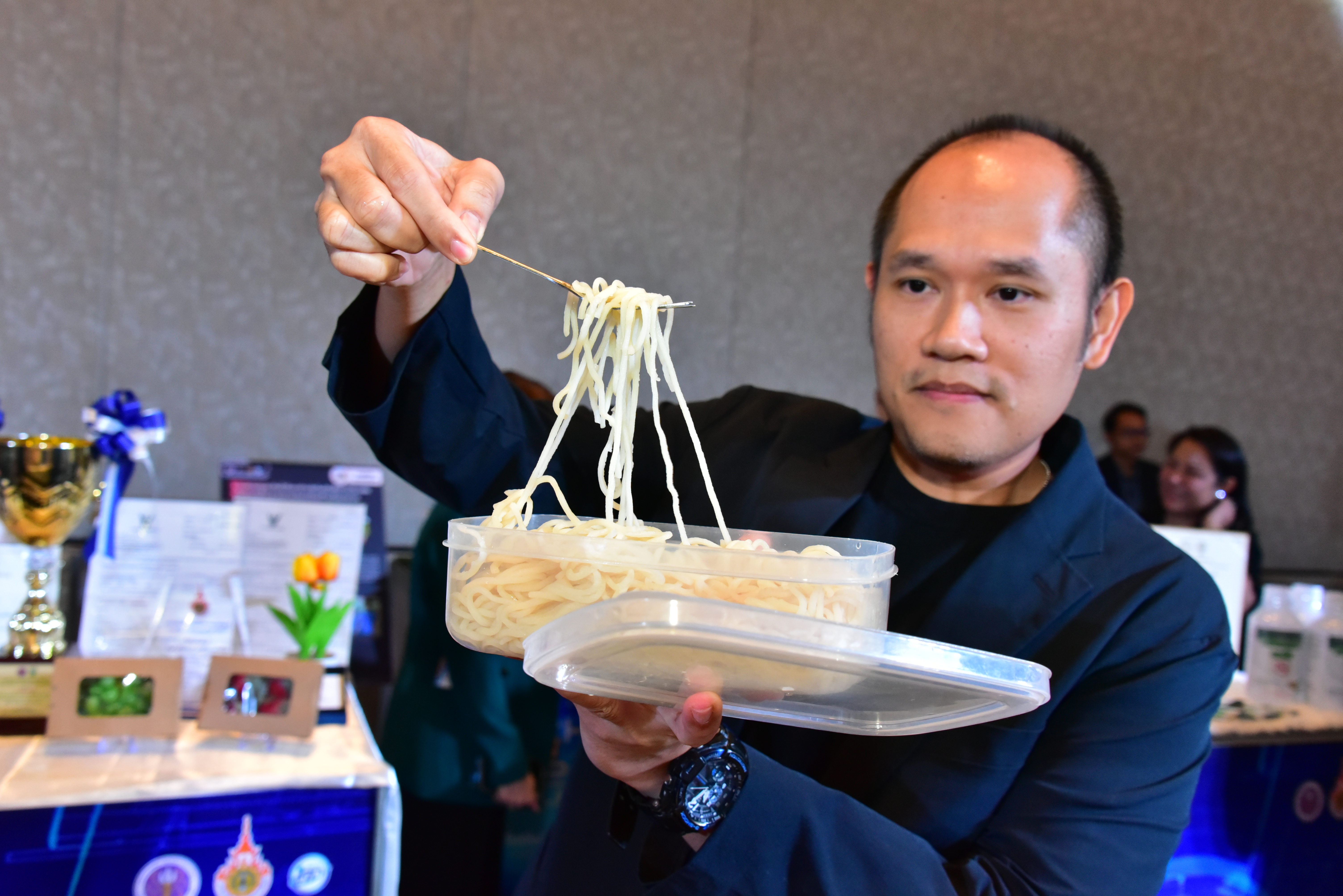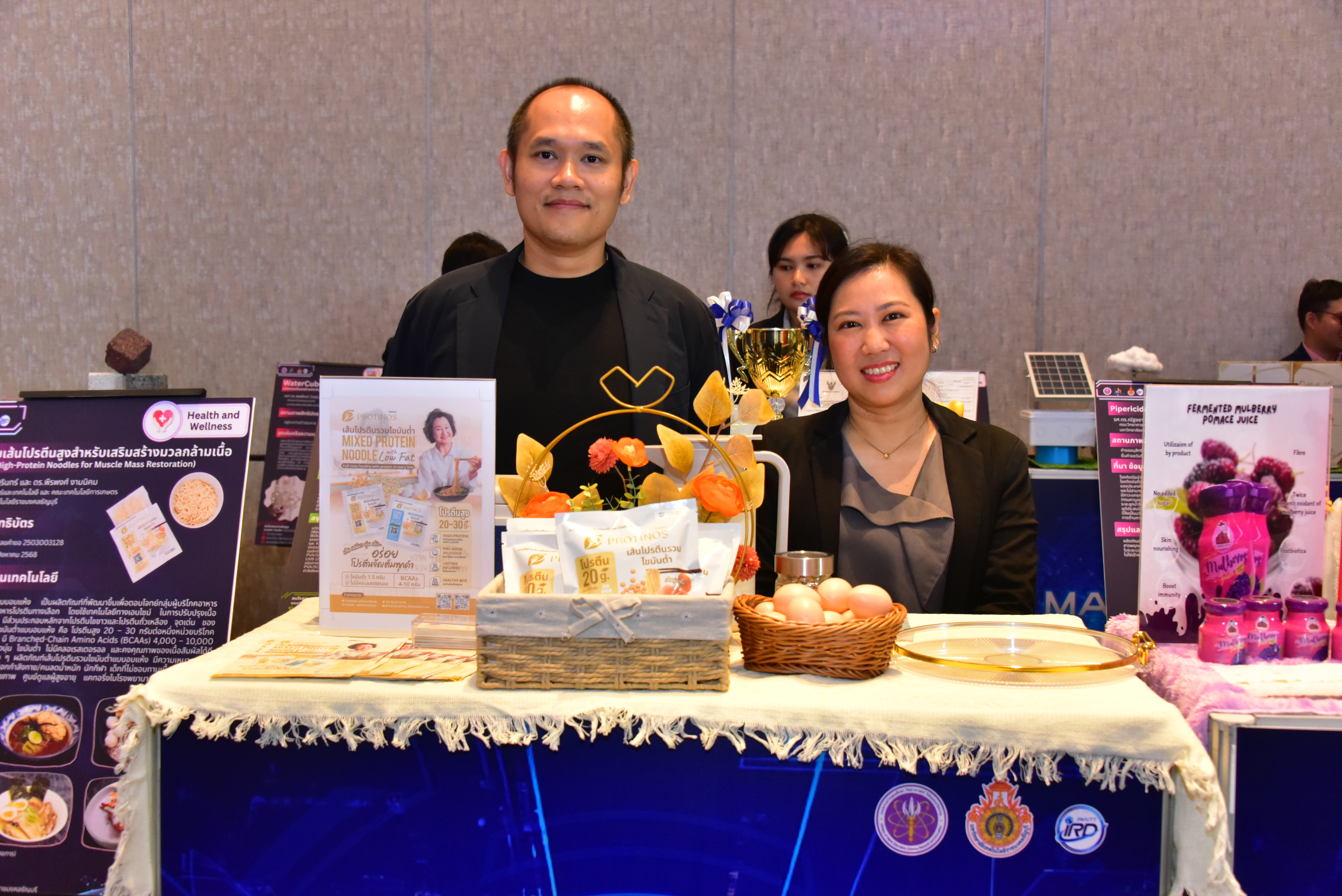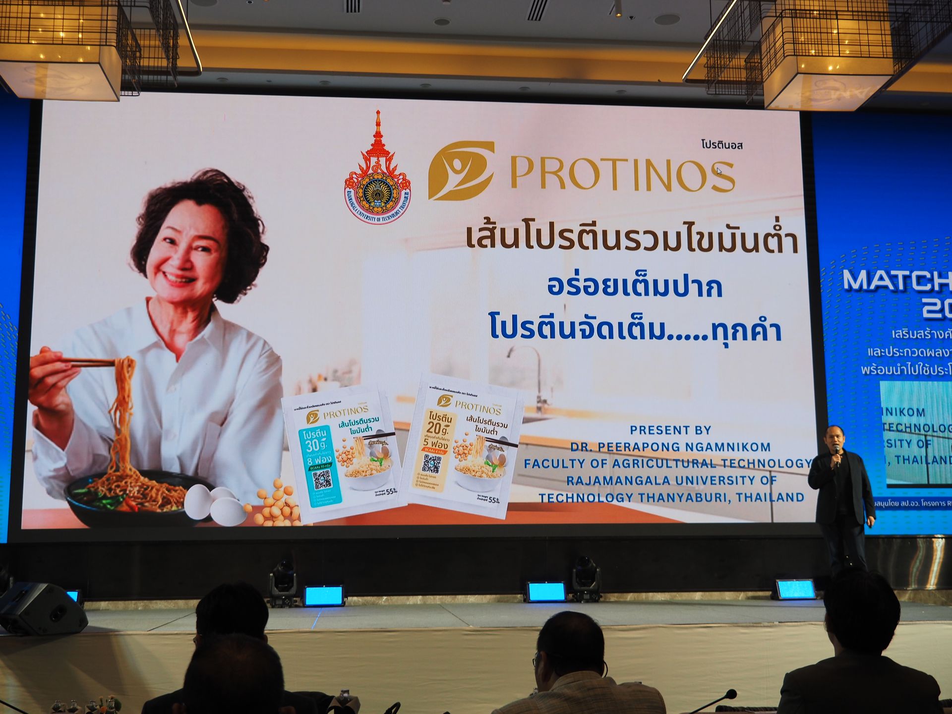 ดร.พีรพงศ์ งามนิคม อาจารย์ผู้เชี่ยวชาญ จากคณะเทคโนโลยีการเกษตร มหาวิทยาลัยเทคโนโลยีราชมงคลธัญบุรี (มทร.ธัญบุรี) และผู้ก่อตั้ง Protinos Foods Company Limited พร้อมด้วย ดร.ศิริลักษณ์ สุรินทร์ จากคณะวิทยาศาสตร์และเทคโนโลยี ประสบความสำเร็จในการพัฒนา ‘เส้นโปรตีนสูง’ (Protinos Noodle) นวัตกรรมอาหารสำหรับผู้สูงวัย เพื่อต่อสู้กับปัญหาภาวะกล้ามเนื้อสลายตัว (Sarcopenia) ที่คุกคามคนไทยกว่า 9 ล้านคน เส้นโปรตีนสูงนี้อัดแน่นด้วยโปรตีนสูงถึง 20 กรัม และกรดอะมิโนสำคัญ BCAAs ที่มีส่วนช่วยสร้างมวลกล้ามเนื้อ 4 กรัม อีกทั้งไขมันต่ำ ไม่มีคลอเลสเตอรอล พร้อมจุดเด่นด้านเนื้อสัมผัสที่เหนียวนุ่มเด้ง ทำให้ผู้สูงอายุสามารถบริโภคได้อย่างปลอดภัยและได้รับโภชนาการที่ครบถ้วน โดยได้รับทุนวิจัยสนับสนุนจากงบประมาณเพื่อสนับสนุนงานมูลฐาน (Fundamental Fund; FF) งบประมาณปี 2567