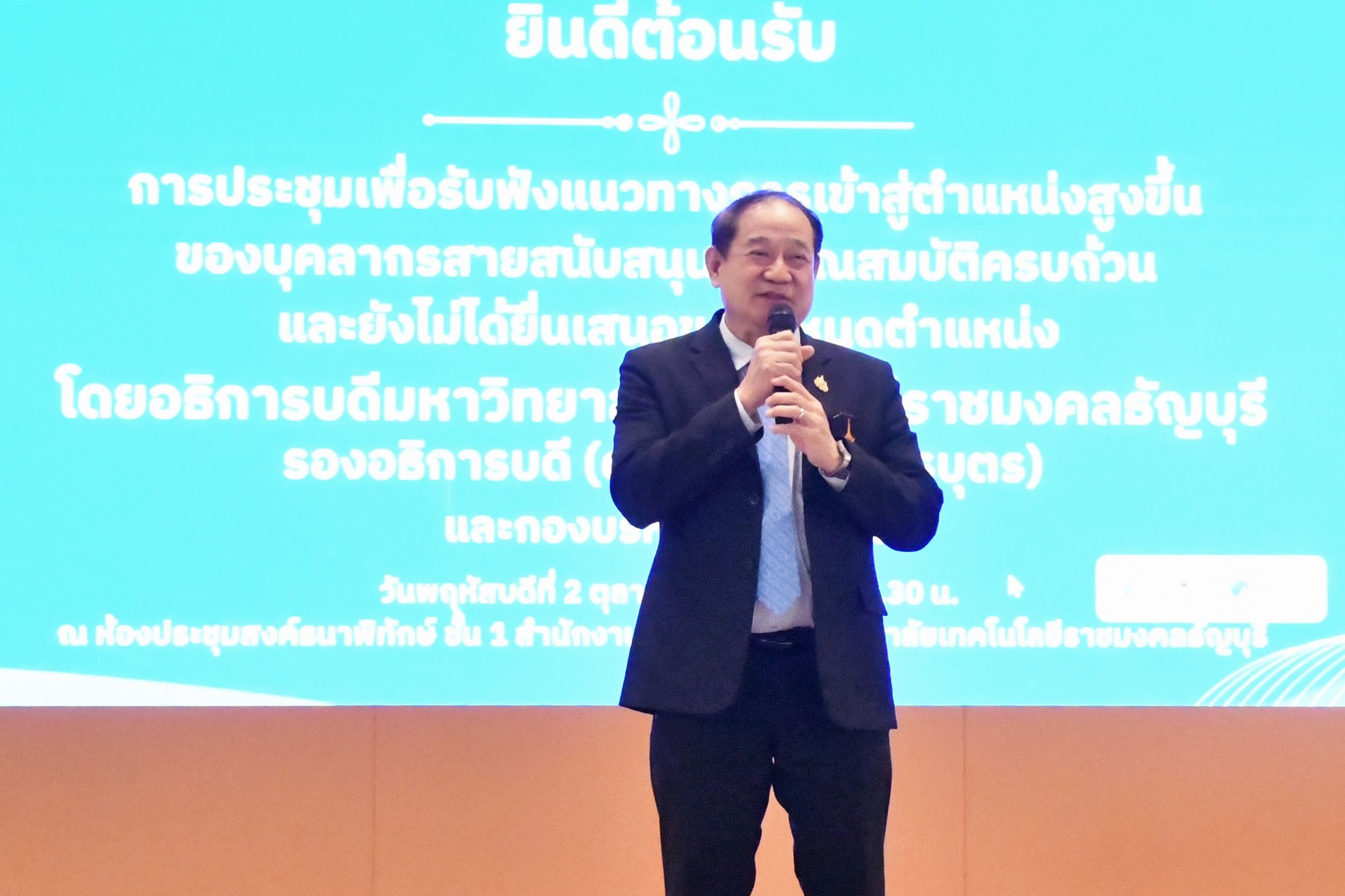 เมื่อวันที่ 2 ตุลาคม 2568 ณ ห้องประชุมสงค์ธนาพิทักษ์ ชั้น 1 มหาวิทยาลัยเทคโนโลยีราชมงคลธัญบุรี รองศาสตราจารย์ ดร.สมหมาย ผิวสอาด อธิการบดีมหาวิทยาลัยฯ เป็นประธานเปิดการประชุมเพื่อรับฟังแนวทางการเข้าสู่ตำแหน่งสูงขึ้นของบุคลากรสายสนับสนุนที่มีคุณสมบัติครบถ้วน แต่ยังไม่ได้ยื่นเสนอขอกำหนดตำแหน่ง